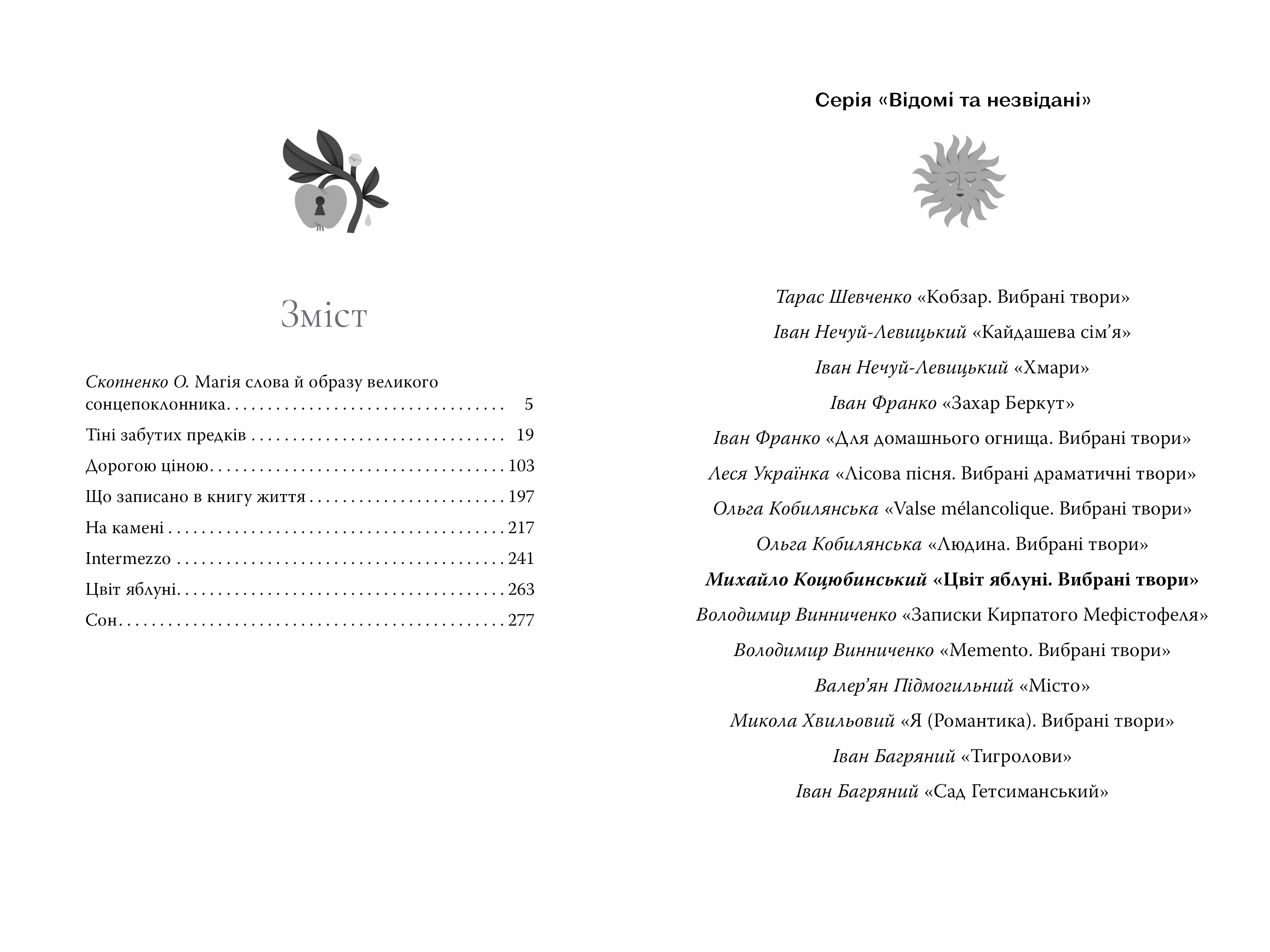 У нашому виданні вміщено найвідомішу прозу видатного письменника: «Тіні забутих предків» (1911), «Дорогою ціною» (1901), «Що записано в книгу життя» (1910), «На камені» (1902), «Intermezzo» (1908), «Цвіт яблуні» (1902), «Сон» (1911). Усі вони — знакові для української літератури й становлять найкращі зразки у своїх жанрах.